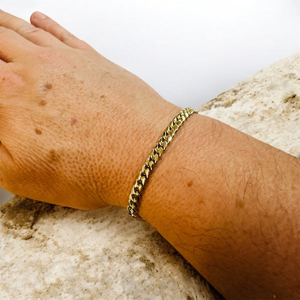 Flex your wrist game with this stunning Miami Cuban Link bracelet that's got serious shine without the serious price tag. Crafted from sterling silver and dressed in 14 karat yellow gold plating, this 5mm beauty delivers that bold, chunky chain aesthetic that turns heads. At 8.5 inches, it's the perfect length to stack, layer, or rock solo. Whether you're dressing up for a night out or adding some sparkle to your everyday look, this bracelet brings the bling and the confidence. Timeless style meets modern swagger.