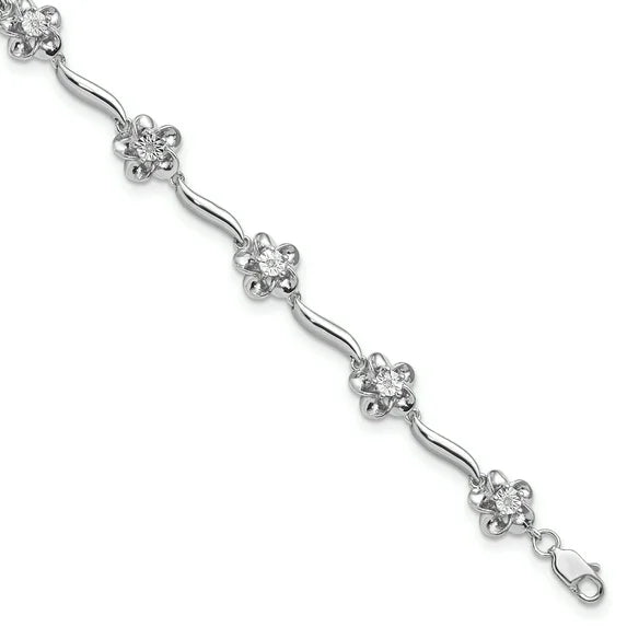 Bloom into elegance with this stunning sterling silver bracelet, where delicate floral motifs dance across your wrist. Each piece features sparkling diamonds nestled within intricate flower designs, while a protective rhodium plating keeps everything gleaming and tarnish-free. Perfect for adding a touch of nature-inspired glamour to any occasion, this bracelet combines timeless sophistication with a whimsical charm that's sure to turn heads.