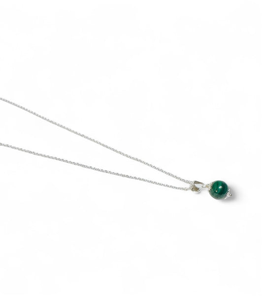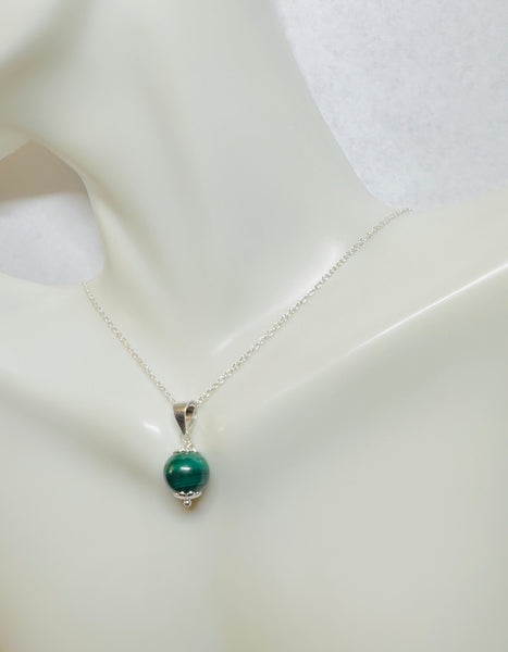 Sterling Silver Genuine 10mm Malachite Bead Pendant with 18" Cable Link Chain