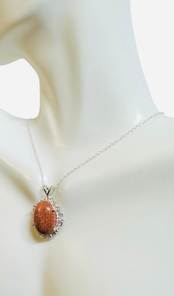 Sterling Silver Oval 18 x 13mm Brown Goldstone "Venturina" Pendant with 18" Cable Link Chain