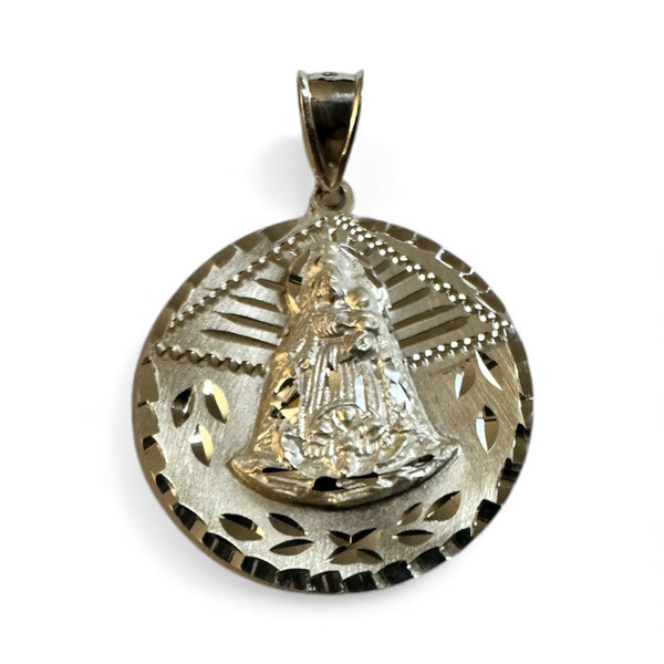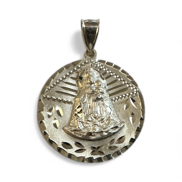 This sterling silver medal pendant honors Our Lady of Charity, the patroness of Cuba, rendered in the traditional "Caridad del Cobre" iconography. Measuring 25mm (1 inch) in diameter, the piece features meticulous hand engraving that captures the devotional artistry characteristic of fine religious jewelry.
