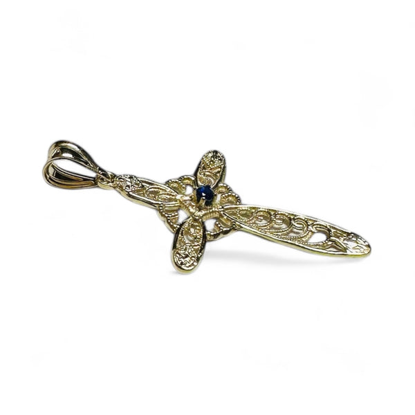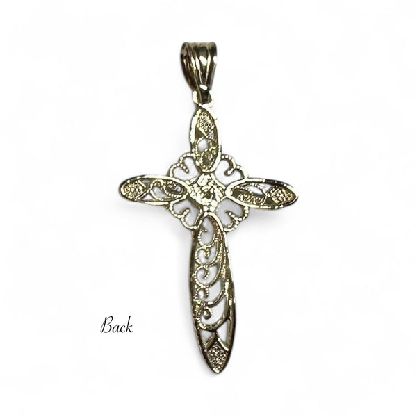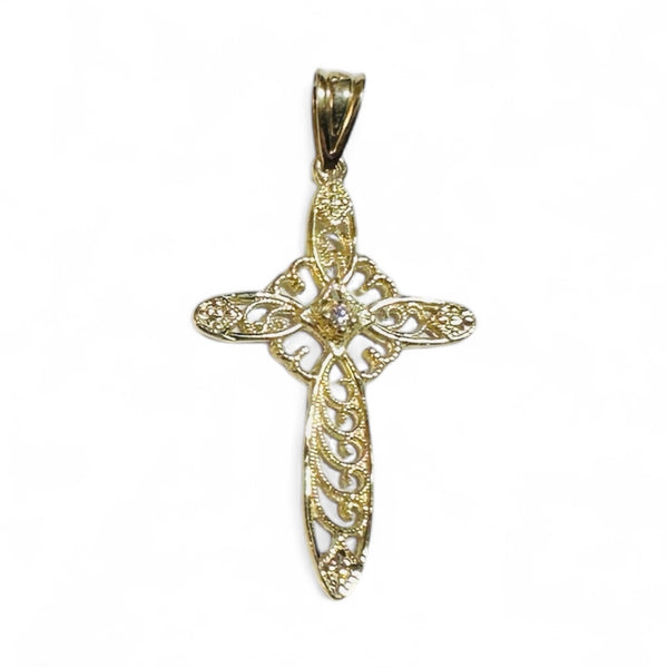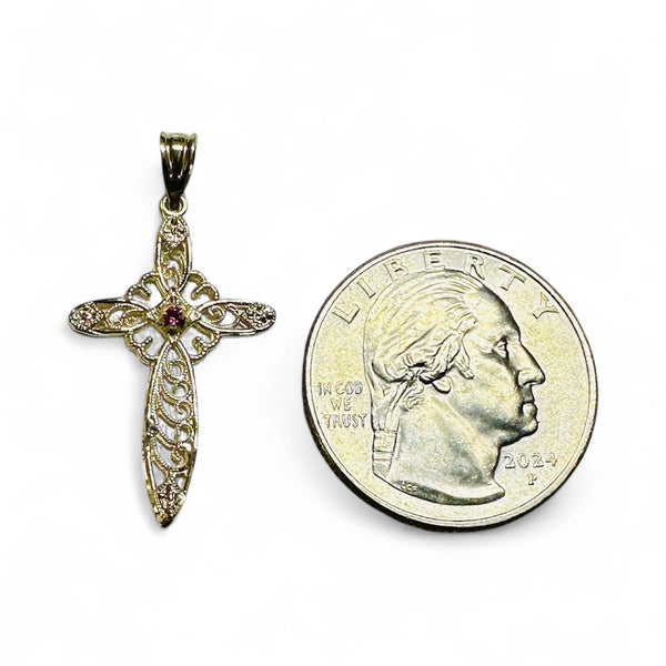Shine bright with this gorgeous 10 karat yellow gold filigree cross pendant—where faith meets fabulous! The intricate filigree detailing creates an airy, ornate design that's equal parts elegant and eye-catching. Yellow gold's warm embrace flatters every complexion and pairs beautifully with any outfit. Ready to customize? Select your gemstone personality: diamond for timeless sparkle, emerald for verdant allure, ruby for passionate pizzazz, or sapphire for serene sophistication. Whether you're stacking it with other pieces or letting it take center stage, this cross pendant is your go-to for adding meaningful style to your everyday look. A treasure that celebrates who you are!