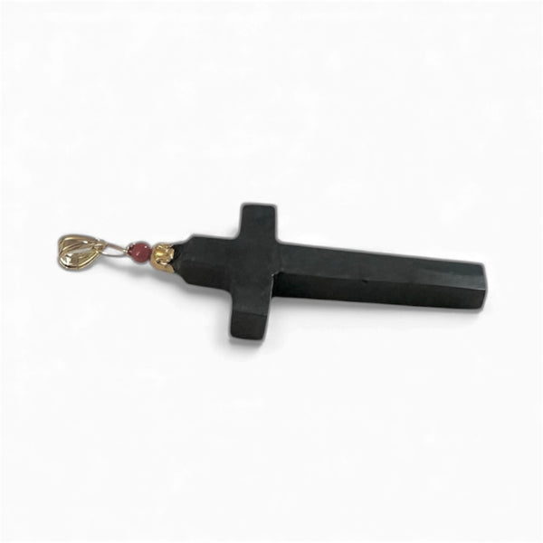 Elevate your style with this radiant cross pendant crafted from 10 karat yellow gold and genuine Azabache. The warm glow of gold beautifully frames the Azabache's rich, ebony depths, creating a mesmerizing contrast that catches the light from every angle. Rooted in heritage and spiritual meaning, this piece celebrates tradition while making a modern fashion statement. Whether you're drawn to its protective symbolism or simply love its sophisticated aesthetic, this pendant is a versatile treasure that works beautifully on its own or layered with other pieces.