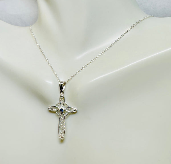 Sterling Silver Genuine Sapphire Filigree Cross Pendant with 18" Cable Link Chain