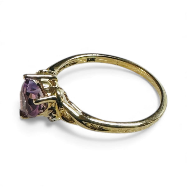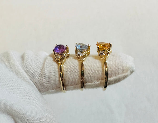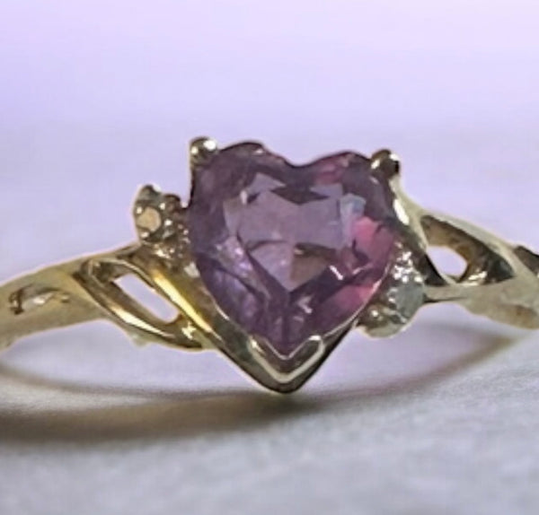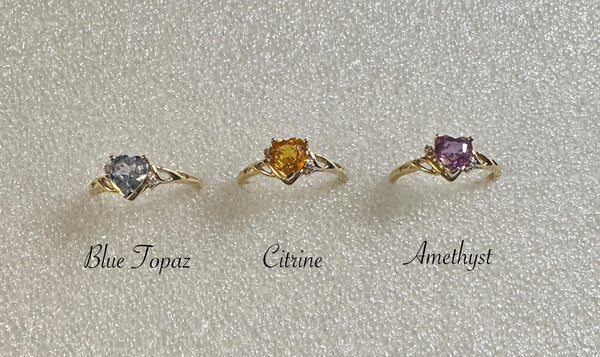 Capture hearts with this stunning 10K yellow gold ring featuring a genuine heart-cut gemstone in your choice of sparkling blue topaz, regal amethyst, or sunny citrine. Delicate diamond accents frame the center stone, adding timeless elegance to this romantic piece. Perfect for celebrating love, marking special moments, or treating yourself to something absolutely gorgeous. A playful yet sophisticated choice that brings color and personality to any jewelry collection.