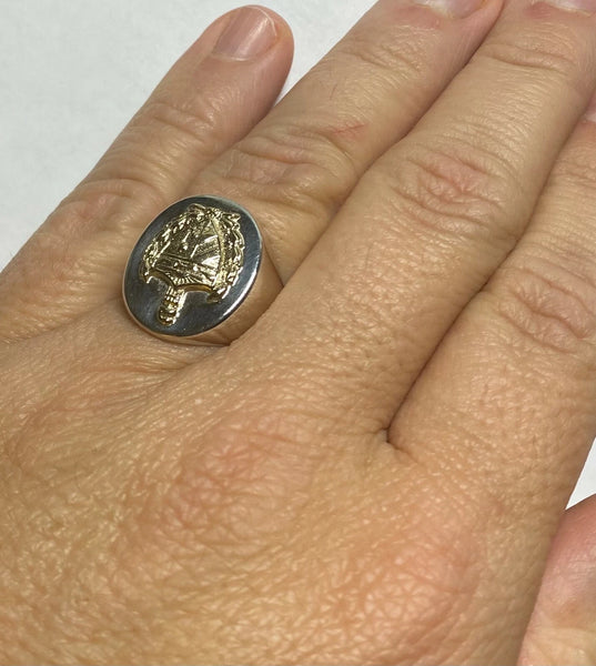 Wear your heritage with flair! This striking signet ring features the iconic Escudo de Cuba coat of arms, masterfully crafted of solid 14 karat yellow gold and soldered on a generous 22 x 18mm bold and heavy sterling silver signet ring. It's the perfect blend of timeless elegance and bold statement-making. Made right here in the USA, this ring lets you carry a piece of Cuban pride on your finger—whether you're honoring your roots or simply love the rich symbolism. A conversation starter that's as distinguished as it is distinctive.