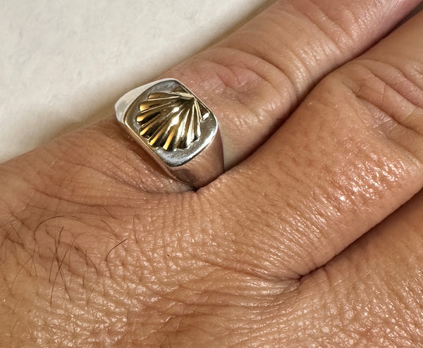 Elevate your style with this sophisticated signet ring featuring a blend of sterling silver and 14-karat yellow gold. The centerpiece showcases the iconic Camino de Santiago seashell, symbolizing the historic Way of Saint James pilgrimage. Crafted for men who appreciate meaningful elegance, this ring seamlessly combines timeless craftsmanship with rich symbolism, making it a distinguished accessory for any occasion.