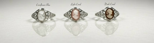 - Features a bezel-set 8 x 6mm plastic cameo in your choice of cornflower blue, light coral or dark coral color