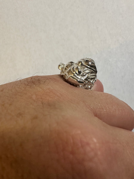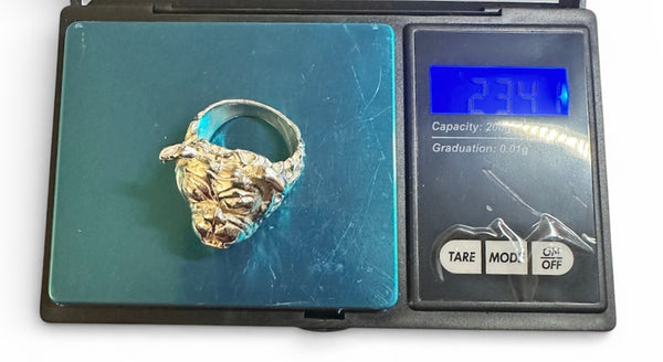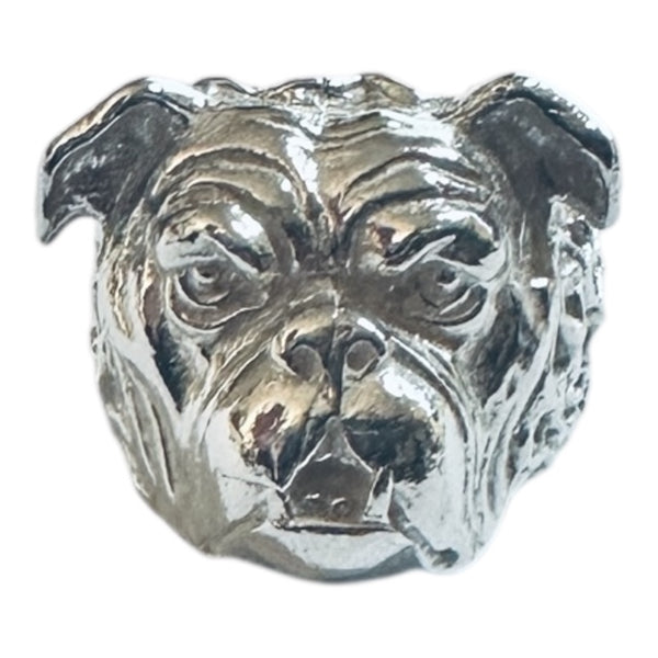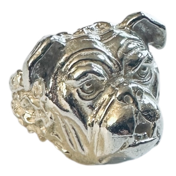 This chunky sterling silver bulldog ring is pure personality on a finger! Weighing in at a hefty 23.40 grams, this vintage beauty features a detailed bulldog head with character and charm. Crafted from solid sterling silver, it's built to last and makes a bold statement for anyone who loves quirky, animal-inspired jewelry. Perfect for collectors of vintage pieces or anyone ready to show off their fun side with serious style.